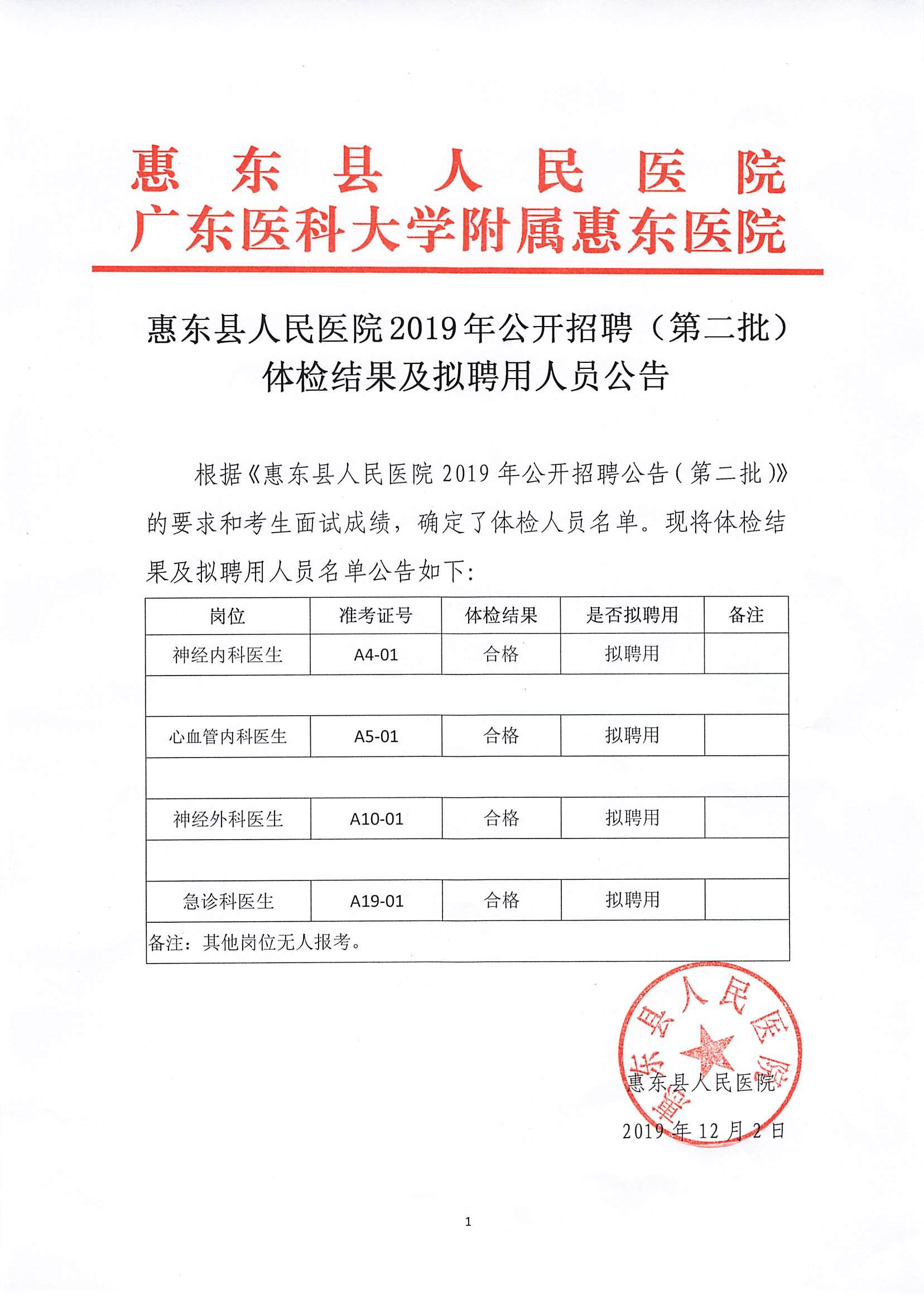 惠东县人民医院2019年公开招聘(第二批)体检结果及拟聘用人员名单公告