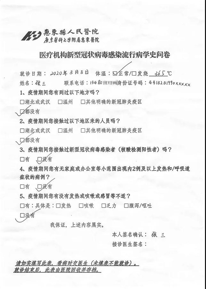 4、所有患者在预检分诊处需配合工作人员进行流行病学史调查,如实填写《新型冠状病毒肺炎流行病学史问卷》并随身携带就诊。(未填表不能进入门诊,当天重复就诊人员携带当天的发票或者门诊日志记录无须重复登记。) ![]()