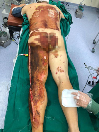 刚进入手术室,患者血压突然下降,进入重度烧伤休克期,生命岌岌可危,杨医生对患者立即行深静脉置管术及处理创面,协助完成术前检查的同时联系我院创伤急救中心相关专家(普外科、颅脑外科、骨科、麻醉科)会诊制定周密预案并参与抢救。历经1个多小时,患者的各项生命体征均恢复平稳状态,暂时保住了性命,转至住院部密切观察治疗。
