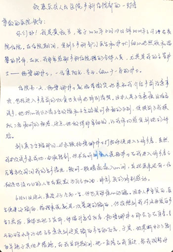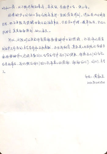 近日,我院产科住院部收到了一封来自黄秋兰患者手写的信,信中,黄女士点名表扬了产科护士杨碧娜同志,对于她专业的职业素质和热情的服务态度表示了高度的赞扬。信中还说道:“我相信,惠东县人民医院还有很多像杨碧娜护士这样辛勤的人在背后守护我们的健康,保障我们的安全...我仍想向你们致上我最衷心的感谢,谢谢你们,你们,辛苦了。”产科医护人员读着感谢信,纷纷表示,能够得到患者和家属的认可和赞扬,即使工作再苦再累也值了!
