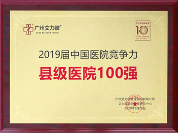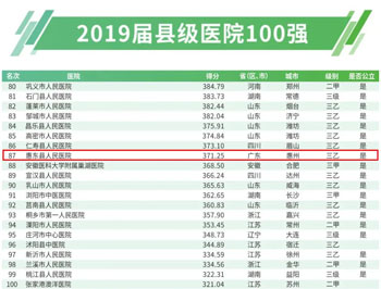 惠东县人民医院荣获“2019届中国医院竞争力县级医院100强”荣誉称号,在“百强榜”上位列87名。