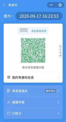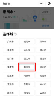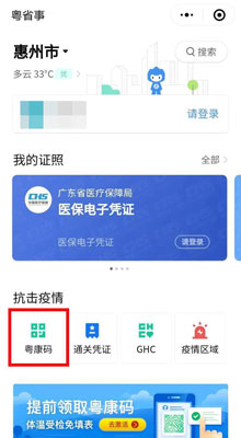 如何出示粤康码? 扫描二维码或用微信搜索“粤省事”小程序,进入小程序(或扫码)前请把手机的GPS定位打开,或者在进入小程序后点击左上角的地址,并把它改成“惠州市”(左图)。然后,点击手机屏幕下方的“粤康码”(右图)。