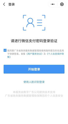 进入小程序点击“粤康码”后,出现该界面(如图),首次登录须要认证,请使用微信支付密码或人脸识别完成登录。