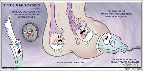 二、“蛋蛋”扭转的临床表现 睾丸扭转通常发病急骤、来势凶猛,患病一侧睾丸和阴囊会剧烈疼痛。扭转初起时疼痛局限在阴囊部位,同时可向下腹和会阴部放射,伴有呕吐、恶心的症状,阴囊会出现红肿,有压痛。当然,也有些患者症状不是很严重,睾丸红肿不太明显,此时家长也不可疏忽大意,睾丸扭转在症状初起后4~6小时内,应尽快手术探查。