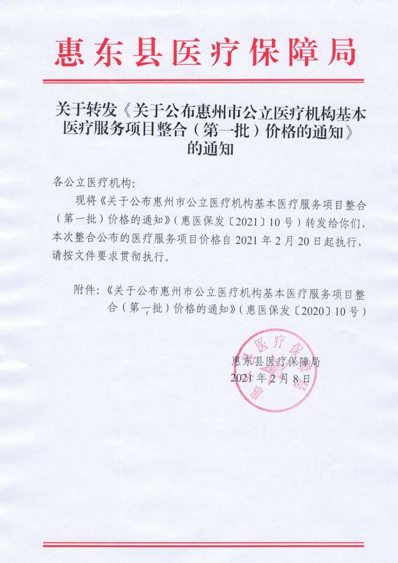 根据惠东县医疗保障局发布的《关于转发<关于公布惠州市公立医疗机构基本医疗服务项目整合(第一批)价格的通知>的通知》文件精神,我院于2021年2月20日零时起执行文件内所列413项医疗服务项目收费标准(不含110100002基层医疗卫生机构一般诊疗费)。