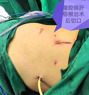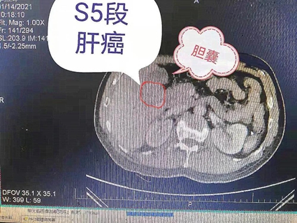 术中见肝癌位于胆囊右侧后方,S5段肝脏脏面,邻近肝门,基底贴近右肝动脉、门脉右支及右肝管,后方贴近肝中静脉,恰巧位于几条重要管道之间,位置特殊,手术极具挑战性,历经4个半小时,手术顺利结束,患者转病房进行后续观察治疗,术后9日恢复良好出院。