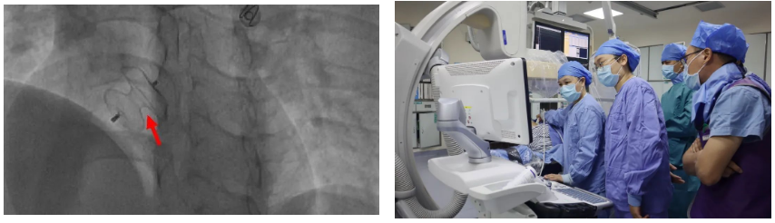 心脏手术犹如“刀尖上起舞”,稍有不慎将造成严重后果,本着一切“以患者生命健康为中心”宗旨,在中山一院帮扶专家龙明教授的指导下,我院心内科、超声医学科、介入室等共同为患者制定了详细的手术方案——DSA下行房间隔缺损封堵术。 排除手术禁忌后,征得患者同意,手术由龙明教授、刘扬主任共同开展,在患者右侧股静脉穿刺点局麻后,送入导管行右心导管检查,准确测量肺动脉压、右房压、右室压、左房压,依据房缺大小选择封堵器,在DSA下封堵器被精准输送至房间隔缺损处一次性释放成功,术中超声医学科黄碧霞主任为患者行心脏彩超显示封堵器释放成型良好,无明显分流。牵拉实验提示封堵器固定牢固,且对二尖瓣、三尖瓣及上下腔静脉均无影响。整个手术过程严谨、配合有序,直至手术完成,用时还不到1小时。