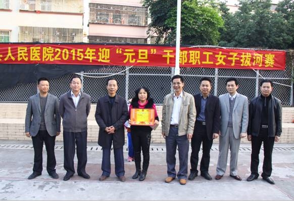为迎接2015新年的到来,在我院领导的大力支持下,医院团总支于2014年12月30日在篮球场举行了一场热闹非凡、别开生面的干部职工女子拔河比赛。 本次比赛共有4支队伍参赛,分别是:行政职能代表队,医技系统代表队,外科系统代表队和内科系统代表队。当天下午,在比赛现场号子声、呐喊声,此起彼伏。行政职能代表队首战告捷战胜了内科系统代表队,外科系统代表队经过激烈的角逐险胜医技系统代表队。在行政职能代表队与外科系统代表队的冠军争夺赛中,群情振奋的拉拉队在场外高喊“1、2加油!1、2加油!”,震耳欲聋的助威声将比赛气氛推上了高潮。最后,行政职能代表队经过努力拼搏,在大家的欢呼声中夺得女子拔河赛的冠军,外科系统代表队获得第二名,医技系统代表队获得第三名,内科系统队获得第四名。