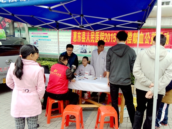 2015年3月11日上午,惠东县人民医院在医院内开展 “2015年无偿献血公益”活动。医院干部职工、志愿者与社会爱心群众积极参与,为保障春节后临床安全用血做出了爱心奉献。 当天早上,在荣超楼门诊大厅旁的献血现场,活动刚开始就排起了长长的队伍,在医院志愿者及工作人员的引导下,献血者们井然有序的填表、检查、抽血等,将自身的血液无私奉献给社会公益事业。医院的志愿者还为每个献血的爱心人士送上一盒牛奶,一杯温水,将一颗颗爱心,一股股热情,传递给大家。据统计,参加此次无偿献血公益活动我院干部职工有53人,志愿者及社会爱心人士有10人,共计63人,献血量共计19800mL。