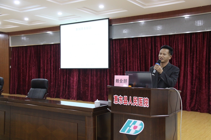 仪式结束后,惠州报业传媒集团惠东新闻中心主任赖金朗老师就《新闻的基本知识》、《如何发现和捕捉新闻》、《结合医院报道案例,如何写新闻》等课题进行了精彩的授课。赖老师将历练总结出的新闻宣传经验传授给学员,让大家对新闻宣传报道有了更直观的感受。