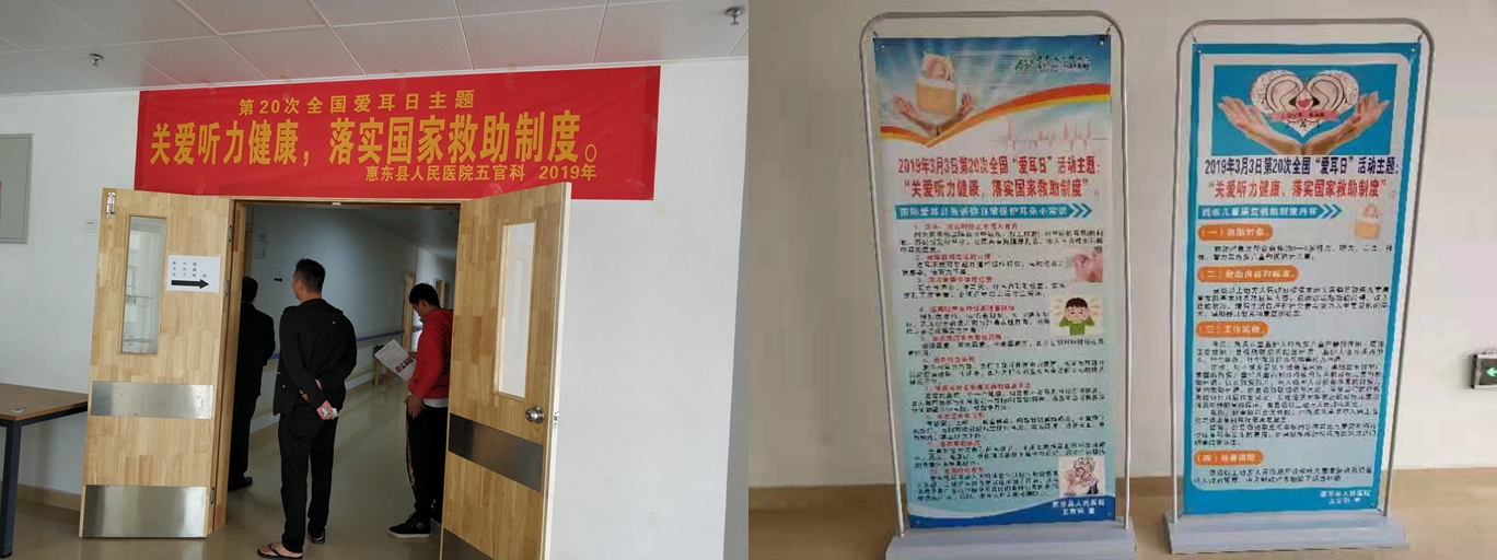 2019年3月3日是第20个全国“爱耳日”,为进一步提高我县人民群众的爱耳、护耳意识,促进听力残疾预防与残疾人精准康复服务工作的有效开展,切实帮助听障人士回归有声世界,五官科围绕“爱耳日”开展了多项活动。 上午,在我院五官科门诊及住院部悬挂宣传横幅标语,为病人普及宣传栏爱耳知识,发放爱耳护耳宣传资料等。