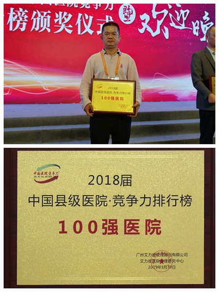 我院连续三年跻身“中国医院竞争力·县级医院排行榜”100强,这是对我院工作的充分肯定。2018年,在县委、县政府的正确领导和上级主管部门的指导下,我院顺利完成新医院整体搬迁工作,是我院发展史上一个里程碑的跨越,对我院建设发展具有划时代的意义。我院将再接再厉,不断提升医疗技术水平,开展更多的新技术、新项目,不断创新优质服务模式,继续加大力度引进及培养人才,加强医院管理,争取取得更大的进步,为我县的卫生事业作出更大的贡献。